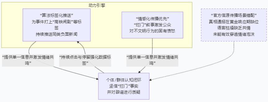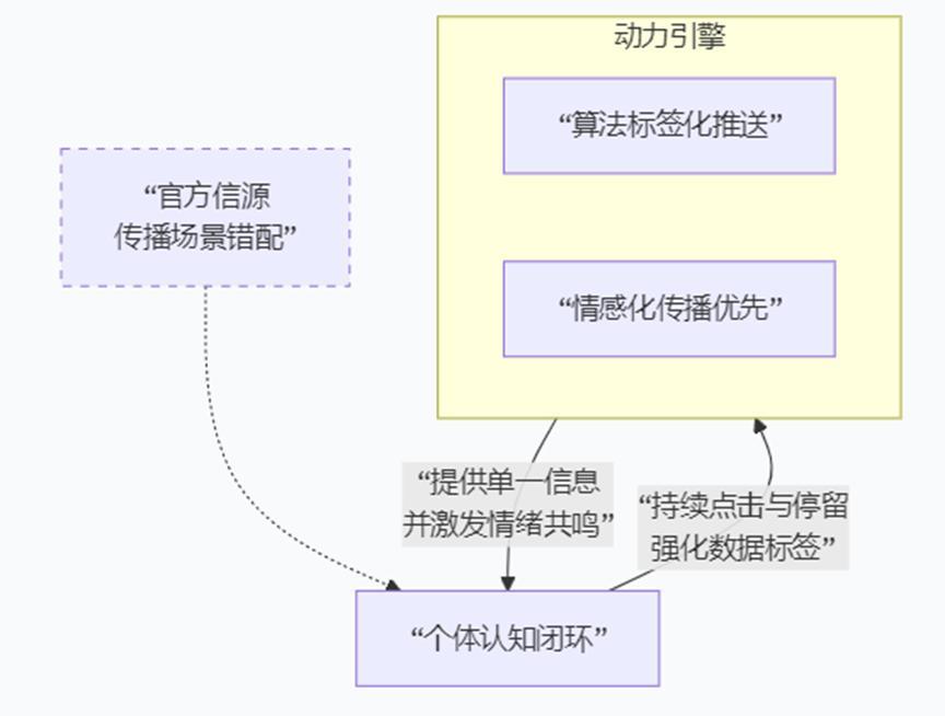 三重机制下,牢固的认知闭环由此形成:闭环算法推送单一信息→情感化内容优先获得关注并固化偏见→官方信源无法有效穿透茧房、提供校正→个体因缺乏差异信息而持续点击同类内容→算法据此进一步强化推送。