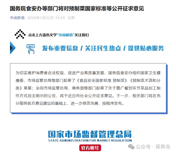 1月22日,国家市场监督管理总局官方账号发布消息,表示有关部门将对预制菜国家标准、术语和分类、推广餐饮环节菜品加工制作方式自主明示等公开征求意见,并表示将在充分吸纳各方意见建议后修改完善。有评论指出,这是民意与国策良性互动的生动实践,也将是各方在公共讨论中凝聚共识的重要范例。