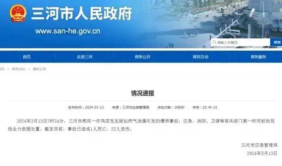 2024年3月,河北三河燕郊发生燃气爆燃事故,造成多人伤亡。事发后,三河市应急管理局及时发布了一份情况通报,认定事故原因系 “一炸鸡店发生疑似燃气泄漏引发”。