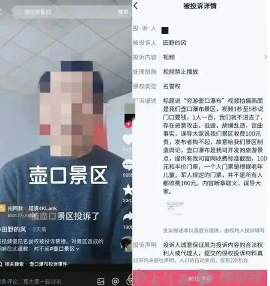 2026年3月8日,一游客(抖音昵称“田野的风”)发布了一段在黄河壶口瀑布景区外围拍摄的视频。 视频中,该游客对着黄河喊话“妈,我们来看你了,门口要钱,一人100(元),我们就不进去了,在这里看看你就行了。”这本是游客正常表达看法,景区却以“侵犯名誉、恶意诋毁”为由,投诉平台下架视频,逼迫博主公开道歉。 3月14日中午,当事游客发布一则道歉视频,并表示原视频因侵犯名誉权遭到景区方面投诉。此举引发全网怒斥,景区文旅形象一落千丈。例如《新京报》快评:《投诉游客吐槽门票贵,景区别太玻璃心》。