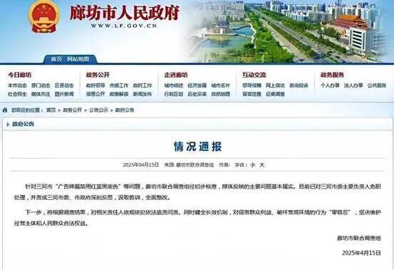 河北三河市曾出台规定,禁用红、蓝、黑三色做商户牌匾底色,并由职能部门督促商户整改。该事件在2025年3月下旬就有相关消息冒头,可是当地并没有引起重视,导致4月上旬不少媒体赶赴当地采访报道。其间,除了有关人员各种不当回应之外,无论是作为当地广告牌匾的主管部门,还是三河市人民政府,一直保持沉默,采取典型鸵鸟式应对,既不正面解释政策初衷,也不回应商户损失赔偿诉求,更不主动纠错整改,试图靠冷处理平息舆论。直至舆情持续升级,官方才被迫于4月15日正式发布首份简短通报,用“市委主要负责人”不点名的方式,模糊责任,回避“为何禁色、商户损失怎么赔”等核心问题,被舆论质疑为“通报无诚意、回避问题”。