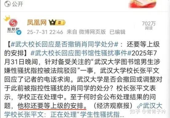 然而2025年7月,法院一审驳回杨某某诉求并认定其诬告后,舆情反转。7月31日,武汉大学校长张平文在接受记者采访时表示:至于何时会公布处理结果,还要等上级的安排。